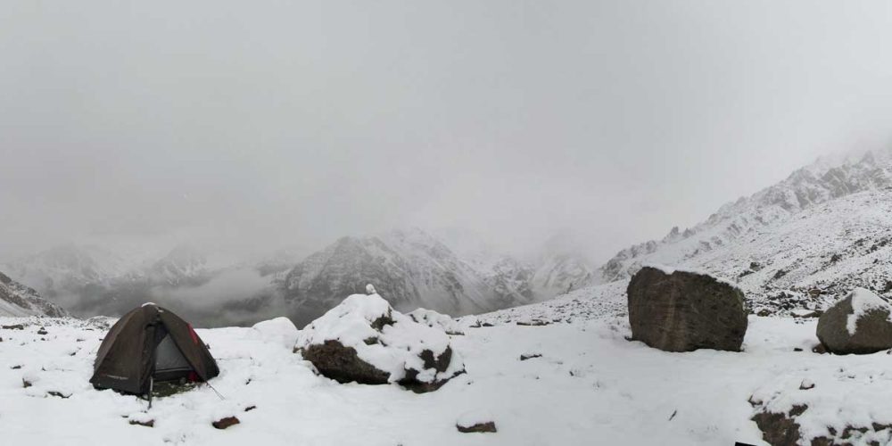 Тучи которые вчера шли, наконец ночью дошли. Утро выдалось тихое. Ещё около пяти была надежда, что распогодится и я сбегу вниз. Проснувшись, услышал слабый шорох по палатке. Снова дождь, подумал я. Расстегнув змейку палатки, я увидел снег. Он вывалился мне прямо на руки в тот момент когда я расстёгивал тент. Палатка была уже придавлена снегом, […]